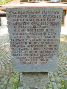 Drei Steinquader mit den Namen der Toten beider Weltkriege (zweiter Weltkrieg nicht aufgenommen) auf dem Wolfschlugener Friedhof..