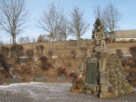An der Ortsdurchfahrt, an einem Hang, an dessen oberen Ende der Friedhof liegt, steht das Denkmal. Aus unbehauenen Steinen ist ein kleiner Berg aufgeschüttet. Oben kniet ein trauernder Soldat. In den Berg eingelassen ist eine Metalltafel mit den Namen der Gefallenen des1.WK´s. Im Hang, im Halbrund angeordnet, sind Metallplatten für die Gefallenen des 2.WK´s eingelassen.