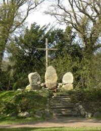Auf drei Findlingen, darüber ein großes Holzkreuz, die Namen der 23 und 30 Kriegstoten aus Wulfelade.