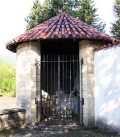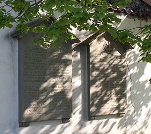 außen an die Friedhofsmauer; 1. Gedenktafeln an der Mauer; 2. angebaute runde Gedenkkapelle, am Altar Inschrift, darüber Mosaikbild, Gedenktafeln an den Wänden; 3. zusätzlich Hinweise zu Soldaten von privaten Gedenksteinen