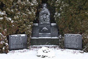 im Friedhof; 3-teilig, mittlerer Teil erhöht mit Steinrelief