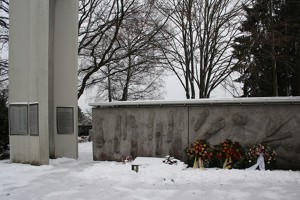 Das Betonrelief ist in Zeichensprache errichtet, um einen geistigen Zusammenhang auszudrücken. Es besteht aus drei Teilen. Zwei davon hängen zusammen, der dritte ist durch ein Lücke getrennt. Der zweite Abschnitt ist eine Folge des ersten, während der dritte Abschnitt eine neuen Anfang setzt. Die Formen des ersten Bildes sind grob und gewalttätig, aber straff senkrecht. Es gibt kein Abweichen aus der Gleichschaltung, sie sind bei aller Verschiedenheit parallel. Sie passen zu dem System von Befehl und Gehorsam, sie erinnern an Stampfen und Marschieren, an Stolz und Kraft. Die Formen des zweiten Bildes neigen sich und werden schwach, sie stürzen und fallen über den Haufen. Sie passen zu Erschöpfung und Zusammenbruch. Die Formen des dritten Bildes fangen klein an, haben ihre Brutalität umgewandelt in Klarheit oder Zartheit, Bescheidenheit und Schönheit. Sie richten sich nach oben (sie lasten nicht nach unten wie die vorigen) und steigen empor. Der Zusammenhang von Größenwahn und Niedergang ist nicht schwer herzustellen, auch findet der, der sich zu sehen bemüht, die Lehre aus dem dritten Feld, das zu dem Auferstandenen in der Aussegnungshalle überleitet. Denn erst bei ihm sind die Opfer und die Täter der Kriege aufgehoben.