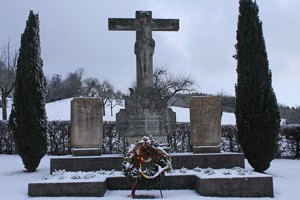 im Friedhof; auf einem Podest 3-teiliges Denkmal darüber Kreuz mit Heiland