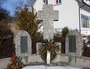bei der Kirche; Steinplatten mit Gedenktafeln, dazwischen Steinkreuz, am Fuß Gedenktafel