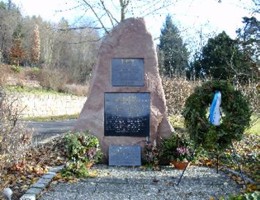 Auf dem Friedhof befindet sich ein Sandsteinfindling, in den zwei Marmortafeln eingesetzt sind. Davor eine Inschriftentafel.