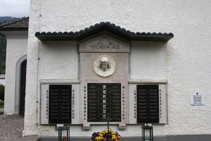 Aussen an der Kirche; Denkmal überdachte Gedenktafeln mit Fotos; zusätzlich Hinweise zu Soldaten von