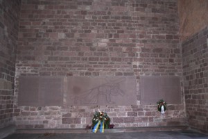 Im überdachten Vorbau an der Klosterkirche; drei Gedenktafeln an der Wand, mittleres mit Relief