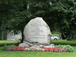 Anklam (Heimatvertriebene), Landkreis Vorpommern-Greifswald, Mecklenburg-VorpommernPLZ 17389 Gedenkstein für die Heimatvertriebenen mit Inschrift, ohne Namen, am Ortseingang in einer Parkanlage.