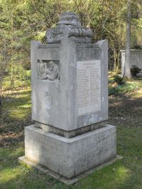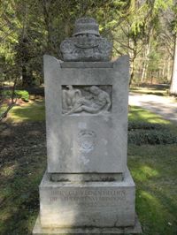 Denkmal auf dem Münchener Waldfriedhof – Obenauf die Skulptur eines Stahlhelms auf einer verzierten