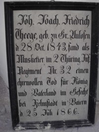 Tafel 1866: Joh. Joach. Friedrich Theege, geb. zu Gr. Aulosen d. 28. Oct. 1843, fand als Musketier