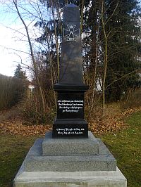 gestaltete, schwarze Stein-Obelisk ist dreiteilig und steht auf einem zweistufigen Sockel. Die Inschriften