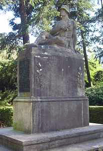 Denkmal für die Gefallenen des 1. Weltkriegs, Quader mit Soldatenfigur im Kurpark von Bad Schmiedeberg. Alte Inschriften entfernt, Namenstafeln erhalten.