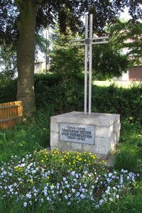 Denkmal mit Steinsockel und Metallkreuz ohne Namen an der Hauptstraße im Ortskern