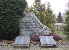 Bei der Kirche ein Naturstein mit Inschrift, davor zwei Gedenktafeln
