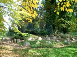 Gedenkanlage 1. Weltkrieg, Großer Findling mit Widmung auf einem Hügel umkreist von Feldsteinen mit