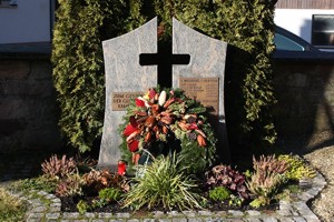 Im Friedhof; zwei stehenden Marmorplatten, Zwischenraum in Form eines Kreuzes, Gedenktafeln