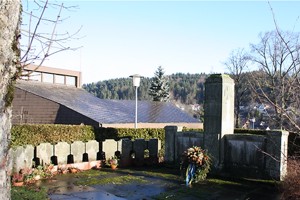 Im Friedhof Betonwand an einer quadratische Säule, Gedenktafeln an der Wand (1. Weltkrieg), davor am