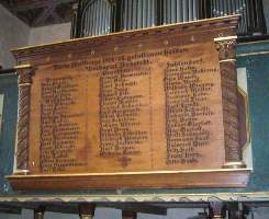 Bodstedt, eine hölzerne Wandplakette an der Orgelbrüstung.