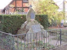 von einem Eisenzaun eingefaßt, ein aufrechter Findling auf einem Sockel aus Natursteinen, darauf ein