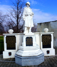 Freistehendes Monument mit Soldatenstatue neben der Pfarrkirche