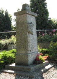 Einzeln stehende quadratische Säule mit Stahlhelm als Krönung