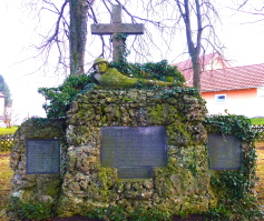 Natursteinmauer mit liegendem Soldaten und Kreuz,