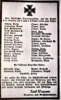 Todesanzeige des Gauleiters Wegener für Opfer von Luftangriffen 1943 auf Bremen