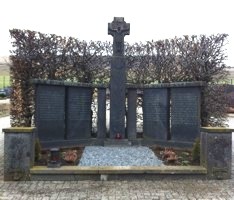 Links und rechts einer Stele mit Christus am Kreuz, in einem leichten Winkel angeordnet, je zwei Tafeln mit den Namen und Daten der Gefallenen und Vermissten der Gemeinde. Auf der Stele von oben nach unten das Eiserne Kreuz, in der Mitte eine Kornpflanze und unten ein Eichenblatt. Die Tafeln stehen auf einem Sockel und werden oben von einem Querstein abgeschlossen. Zwischen Tafeln und Stele je eine eckige Säule. Im Vordergrund eine Stufe, die von zwei kleineren Säulen, darauf ein mit Efeu umkränztes Schwert und links der Jahreszahl 1914 und recht der Jahreszahl 1918, eingeschlossen wird. Im Hintergrund wird das Ehrenmal von einer Hecke abgeschlossen.