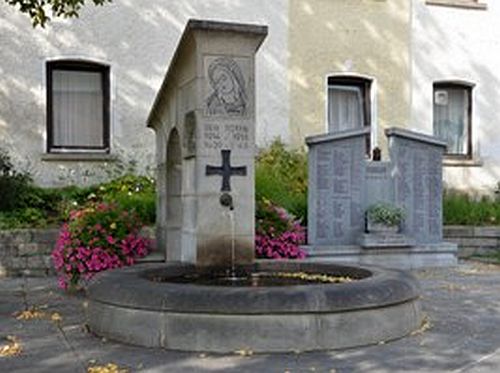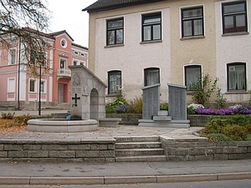 Brunnen mit Schrägdach und Steintor, dahinter Gedenktafeln.