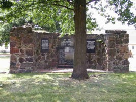 Halbrund gestaltetes Denkmal, gemauert aus behauenen Natursteinen