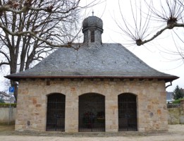 Vor dem Eingang des Friedhofs steht eine mit Naturstein gemauerte Gefallenen-Kapelle. Das Walmdach mit Glockenturm ist mit Schiefer gedeckt. Auf der Vorderseite des Gebäudes sind drei Eingänge, abschließbar durch schmiedeeiserne Türen. Im Innern der Kapelle befindet sich an der gegenüberliegenden Wand ein mehrteiliges Denkmal aus hellem Sandstein für die Gefallenen des Ersten und Zweiten Weltkriegs. Das Ehrenmal besteht aus einem Bildrelief in der Mitte und rechts und links, als äußerer Teil acht Steintafeln. Auf ihnen sind die Namen und Geburtsdaten der Gefallenen in goldener Schrift eingraviert. Das Bild in der Mitte stellt einen sitzenden, sterbenden Krieger und einen stehenden mit brennender Fackel dar. Im Sockelbereich des Denkmals, unter einem Absatz stehen die Namen der im Zweiten Weltkrieg gefallenen und vermissten Soldaten. In der Kapelle befindet sich außerdem noch ein Grabstein für einen im Ersten Weltkrieg gefallenen, (und hier beigesetzten?) Soldaten. In einer Grünanlage auf der linken Seite der Kapelle erinnert ein Gedenkstein an die Opfer der Heimatvertriebenen.