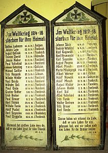 Zwei Holz-Ehrentafeln in der evangelisch-lutherischen Kirche zu Czarnylas (deutsch Schwarzwald) im Wartheland,  Polen
