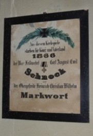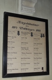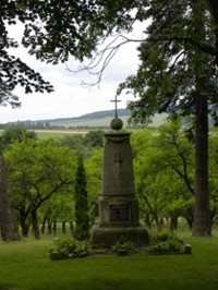 Am Kirchplatz hinter einem kleinen Eisenzaun eine Stele zum Gedenken an die Kriege des 18. Jahrhunderts, auf der Spitze ein goldfarbener Adler. Gedenktafel für zwei Kriegsopfer von 1866 in der Kirche. Am Westende des Friedhofs das Ehrenmal für die 58 Kriegstoten des Ersten Weltkrieges, ergänzt um die Daten auf Gedenktafeln in der Kirche.