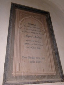 Tafel: Mit Gott für König und Vaterland starb aus dieser Gemeinde (Name, Daten) Dem König treu, wie unsere Väter.