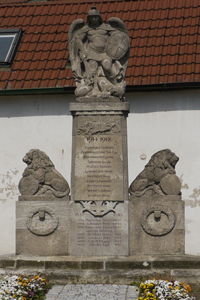 Auf dem Denkmal in der Ortsmitte der Erzengel Michael, der den Teufel tötet