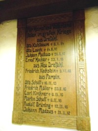 Die Gedenktafel für die Gefallenen des 1. Weltkriegs in der Kirche enthält mehr Informationen als das Denkmal. Ein Name befindet sich nur auf dem Denkmal.