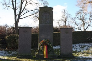 Im Friedhof drei stehenden Steinplatten, die mittlere oben mit Bildrelief „zwei gefallene Soldaten“