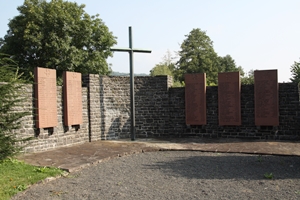 fünf Sandsteinplatten mit den Namen angebracht. Auf dem Platz steht ein großes Kreuz aus Kupfer.
