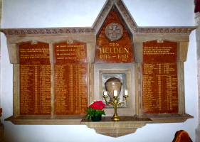 Den Helden 1914 – 1918 Ruhet sanft! Ihr tapfern Krieger, niemals kehrt ihr in eure Heimat wieder; euer Lohn steht in Gotteshand, Weil ihr gekämpft fürs Vaterland. (Namen) Mit Wehmut sei der Helden hier gedacht, die kämpfend für das liebe Vaterland ihr Gut und Blut zum Opfer treu gebracht gekrönt mit Preis sind sie von Gotteshand! (Namen) Empfanget dort zu eurem Lohne, für eure treue Kriegespflicht im Jenseits jene Liebeskrone in unseren Herzen sterbet ihr nicht. (Namen)