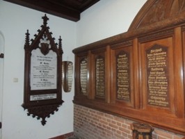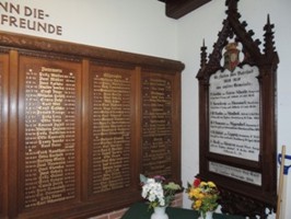 Längswänden die 8 bzw. 9 holzgeschnitzten Gedenktafeln mit den Namen der 73 Kriegstoten des Ersten