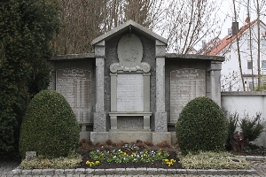 Bei der Kirche eine überdachte Wand, der mittlere Teil erhöht und vorspringend, vorne Gedenktafeln; zusätzlich Hinweise zu Soldaten von privaten Gedenksteinen