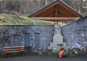 Im Friedhof, neben der Abdankungshalle; überdachtes Denkmal oben mit Steinplastik „knieender Soldat“,