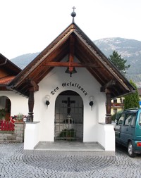 Gegenüber der Kirche; Gedenkkapelle, innen Altar und Kruzifix, seitlich Gedenktafeln