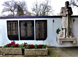 Wandtafeln an der Mauer neben der Aufbahrungshalle seitlich Soldatenstatue auf Sockel; zusätzlich Hinweise zu Soldaten von privaten Gedenksteinen.