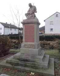 Kniende Soldatenfigur mit Helm, Tornister und Gewehr, die Hände zum Gebet gefaltet.