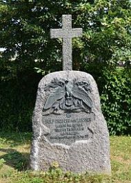 Grabstein mit Preußen-Adler Inschrift: Dulce et Decorum Patria Mori und darunter: Ritter des Eis. Kr. I. u. II. Kl. fiel als Kampfflieger.