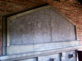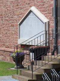 Steintafel an der Außenwand der evangelischen Christus-Kirche in Frankfurt-Nied. Die Namenstafel wurde im Mai 2008 wegen Umbau- und Sanierungsmaßnahmen von ihrer ursprünglichen Stelle entfernt und an der gegenüber liegenden Seite der Kirche wieder angebracht.