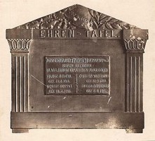 Frankfurt am Main-Schwanheim (Männerquartett Eintracht), HessenEhrentafel für die im Ersten Weltkrieg gefallenen Vereinsmitglieder. Der ursprüngliche Standort der mit Eichenlaub, Helm und Lorbeerzweig verzierten Gedenktafel ist unbekannt. Das Bild stammt von einer Postkarte von E. Skrivanek, Frankfurt a. M.