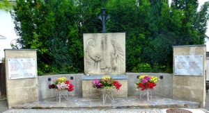 Freistehende ovale Wand in der Mitte Relieftafel flankiert von zwei