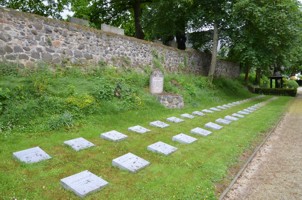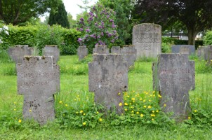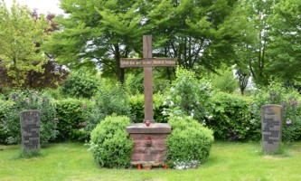 Schulkameradschaft. Kriegsgräberfeld Zweiter Weltkrieg: Zwei Felder mit 60 steinernen Grabkreuzen mit